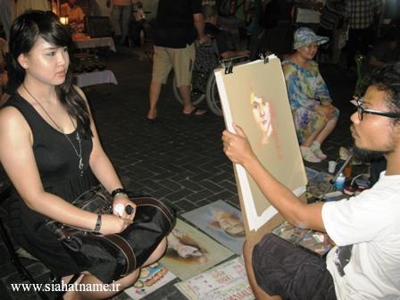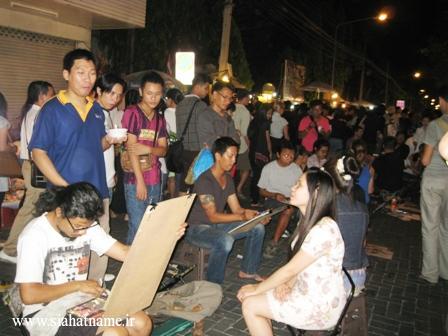 شب که شد هنرمندان نقاش چیانگ مای بساط هنرنمایی را در گوشه ای از بازار پهن کردند. آنقدر فضای خوبی بود که دوست داشتم من هم بنشینم تا عکسم را بکشند. تنها عیب سفر با کوله پشتی همین است که برای برداشتن وسایل ظریف دچار شک می شوی!