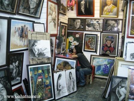 داخل پاساژ، دهها فروشگاه نقاشی چسبیده به هم به این شکل قرار گرفته اند و نقاشان آهسته و به دقت روی بومهایشان نقش می زنند. از قدم زدن در این دالان خسته نخواهید شد…