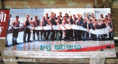 زیرنویس این تابلو می گوید، مارماهی به طول ۸/۷ متر ملقب به ملکه ناگاس، در سال ۱۹۷۳ توسط ارتش امریکا در رودخانه مکونگ شکار شده است.